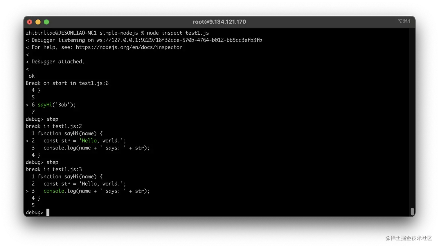 执行node inspect test1.js 可以进入命令行调试程序,会自动在运行的第一句代码处断点。