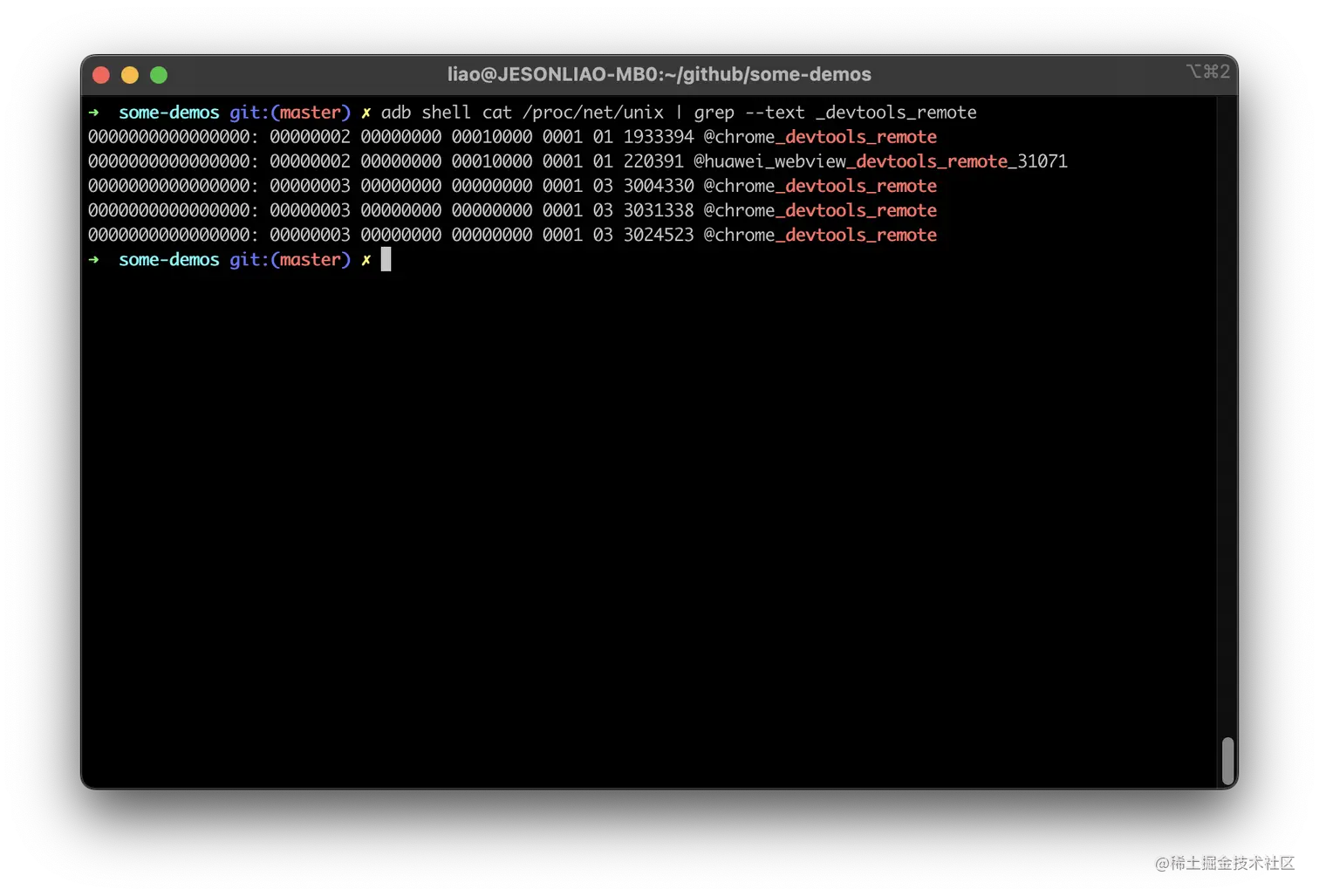 adb shell cat /proc/net/unix | grep --text _devtools_remote