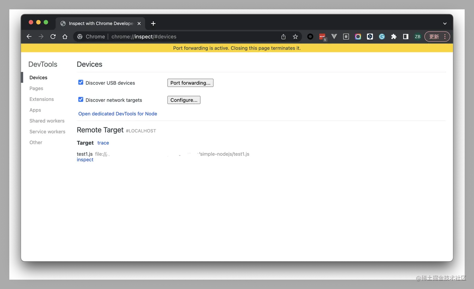 也可以用Chrome打开chrome://inspect/ ,可以找到该进程进行调试。