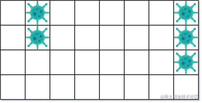 假设世界由 的二维矩阵 isInfected 组成,isInfected[i][j] == 0 表示该区域未感染病毒,而 isInfected[i][j] == 1 表示该区域已感染病毒。可以在任意 个相邻单元之间的共享边界上安装一个防火墙(并且只有一个防火墙)。