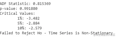 在这里的结果中,我们可以看到时间序列的p值大于0.05,我们可以说我们未能拒绝无效假设,时间序列是非平稳的。