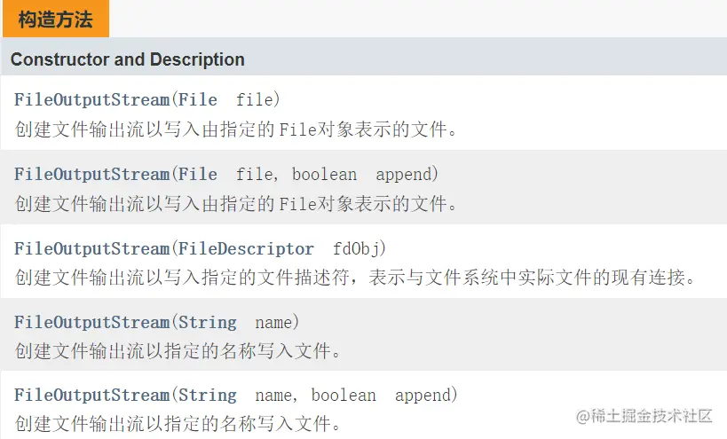| FileWriter(String fileName) | 构造一个给定文件名的FileWriter对象。 |