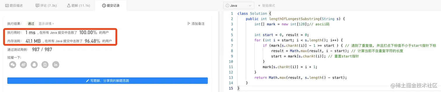 if (mark[s.charAt(i)] - 1 >= start ) { // 遇到了重复值, 并且打点下标值不小于start指针下标