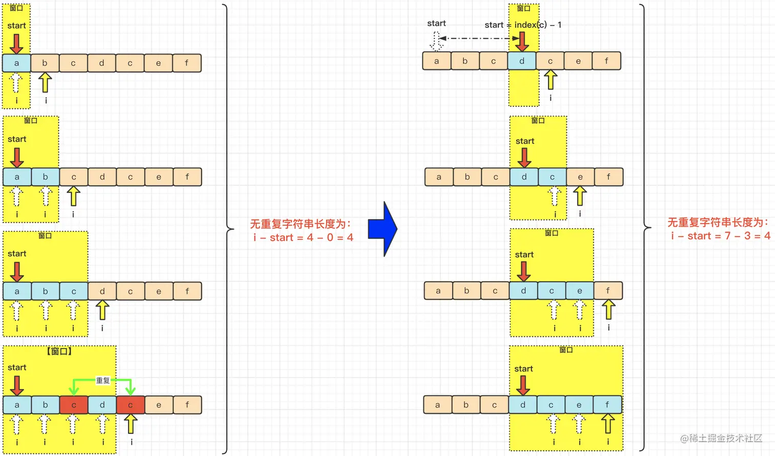 通过start指针和i指针,我们可以构造一个窗口,在窗口中的所有元素,有一个非常重要的特征,就是——都是无重复的。所以,在窗口内的元素,就不需要再遍历对比了。所以,当发现有重复元素的时候,我们直接赋值start = index(c) -1来实现start的跳跃。由于在整个窗口中,是以start开始以i结束的,所以,通过i - start就可以计算出无重复字符串长度。具体逻辑如下图所示: