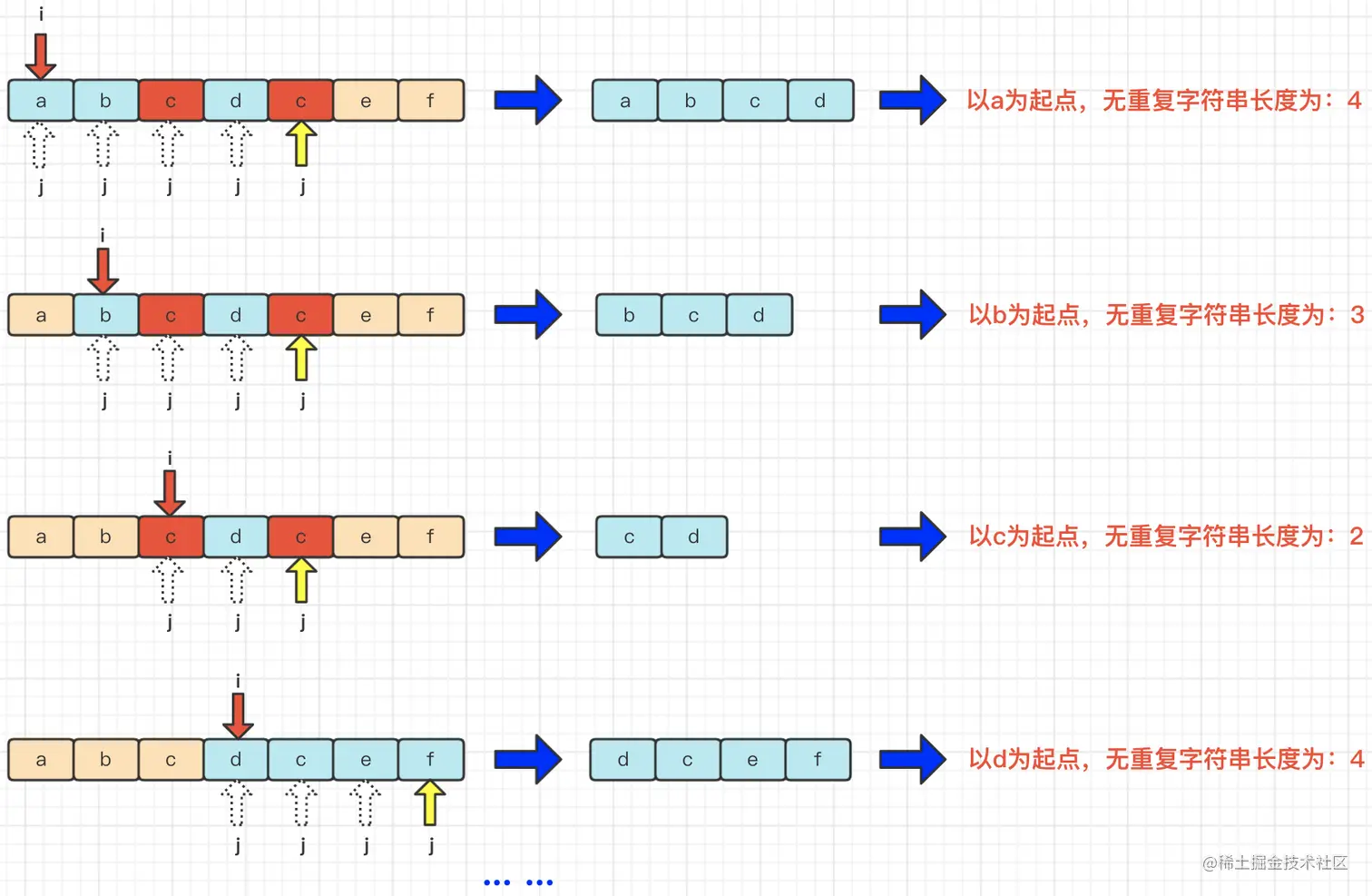 通过两层for循环可以实现暴力破解寻找无重复字符串,最外层i循环,作为每次生成子字符串的头节点;第二层j循环,每次从i位置开始,拼装子字符串。最后选择长度最长的作为返回值。具体逻辑如下图所示: