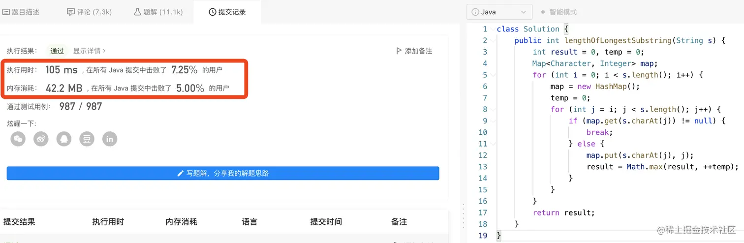 【解释】因为无重复字符的最长子串是 "wke",所以其长度为 3。请注意,你的答案必须是子串的长度,"pwke" 是一个子序列,不是子串。