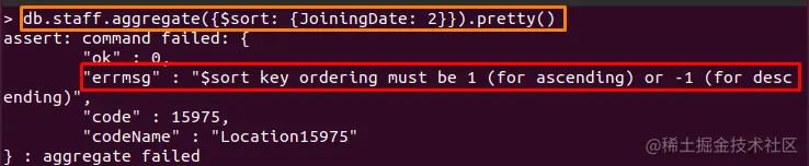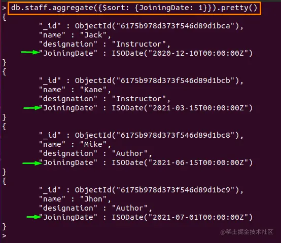 参照上例中使用的 "staff"集合的文件。下面提到的命令将使用聚合方法中的**$sort**操作符对文档中的 "JoiningDate"字段进行排序。
