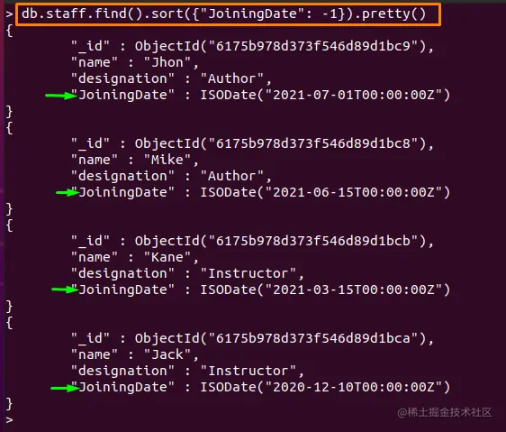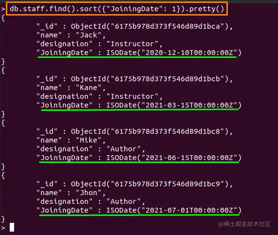 按照 "sort()"方法的语法,下面写的命令将以升序对文档进行排序。此外,排序是在代表工作人员加入日期的 "JoiningDate"字段上进行的。