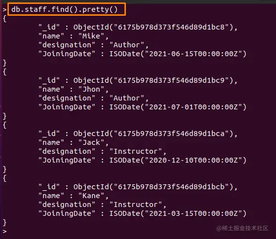 >db.staff.find().pretty()
