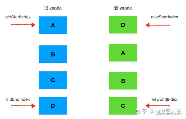我们需要 4 个指针,分别指向新旧两个 vnode 数组的头尾: