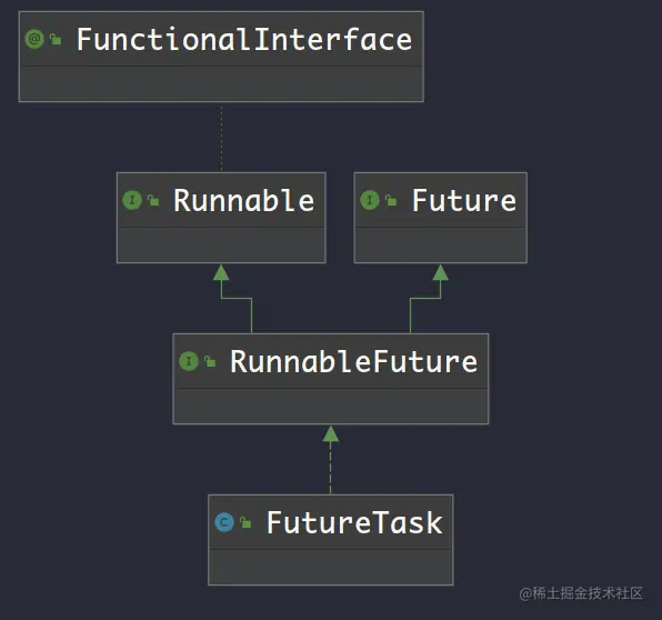 从上面的继承结构我们可以看出FutureTask实现了Runnable接口,而上面的代码当中我们最终会将一个FutureTask作为参数传入到Thread类当中,因此线程最终会执行FutureTask当中的run方法,而我们也给FutureTask传入了一个Callable接口实现类对象,那么我们就可以在FutureTask当中的run方法执行我们传给FutureTask的Callable接口中实现的call方法,然后将call方法的返回值保存下来,当我们使用FutureTask的get函数去取结果的时候就将call函数的返回结果返回回来,在了解这个过程之后你应该可以理解上面代码当中FutureTask的使用方式了。