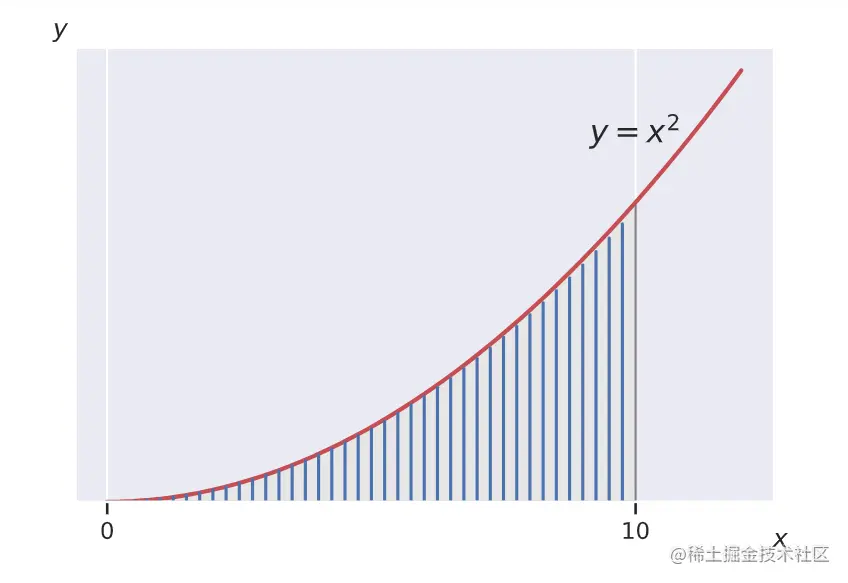接下来我们用一个例子去具体体会并发带来的效果提升。我们的这个例子就是求函数的积分,我们的函数为最简单的二次函数,当然我们就积分(下图当中的阴影部分)完全可以根据公式进行求解(如果你不懂积分也没有关系,下文我们会把这个函数写出来,不会影响你对并发的理解):