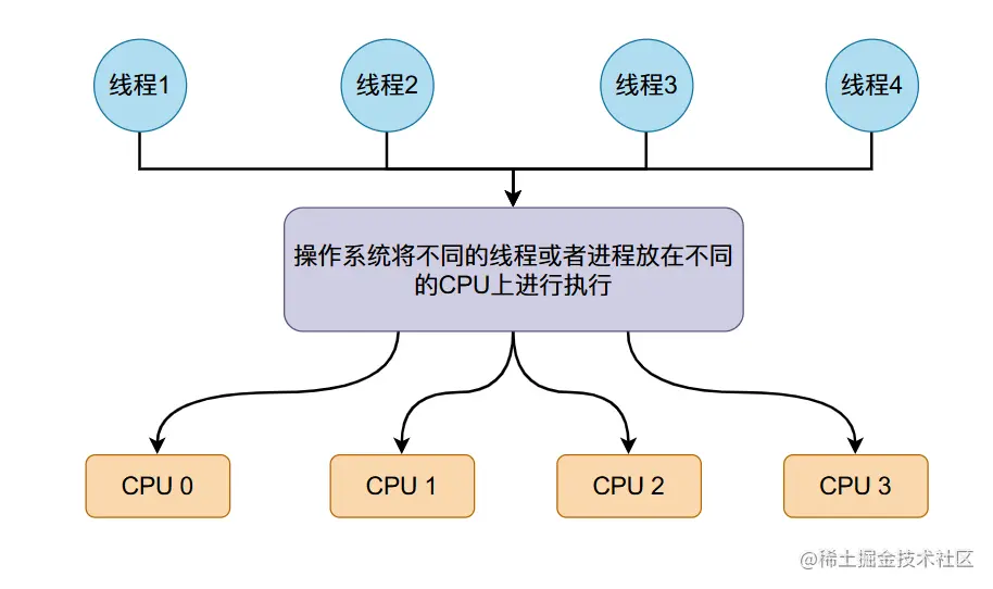 上面代码当中不同的线程需要得到CPU资源,在CPU当中被执行,而这些线程需要被操作系统调度,然后由操作系统放到不同的CPU上,最终输出不同的字符串。