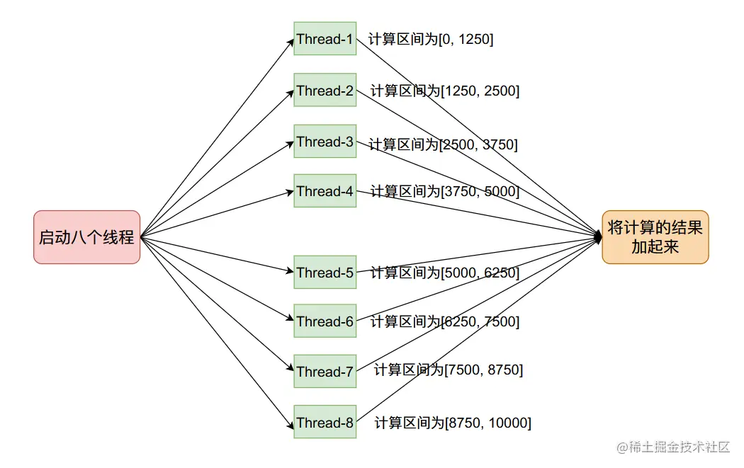 因为我们是采用8个线程来做这件事儿,因此我们可以将这个区间分成8段,每个线程去执行一小段,最终我们将每一个小段的结果加起来就行,整个过程大致如下。