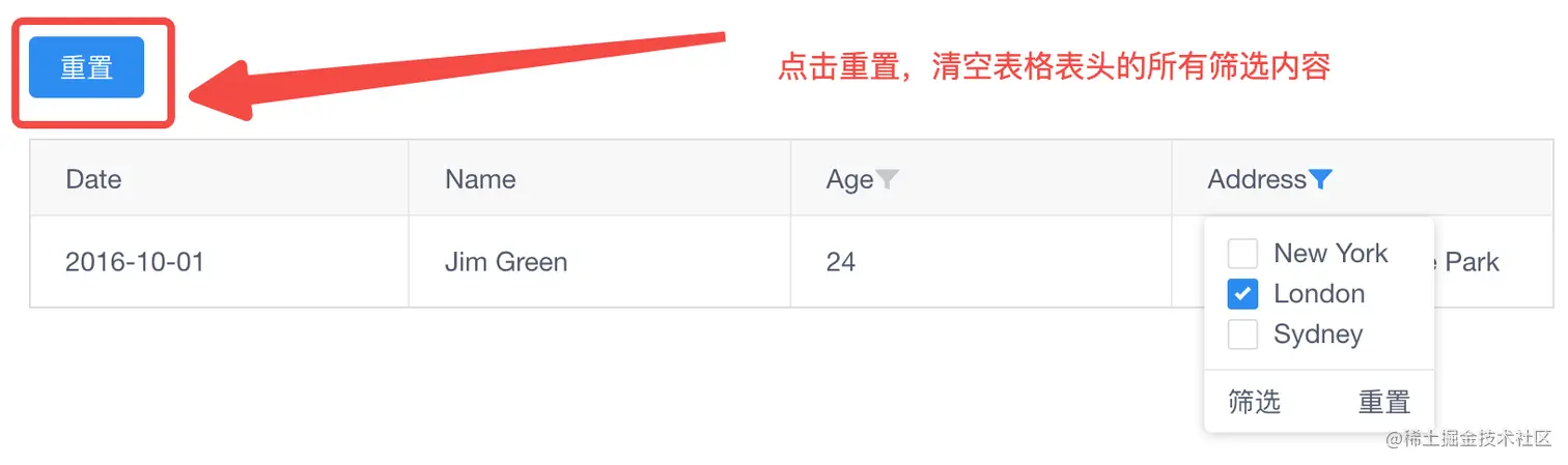 它使用了挂载在表格实例上的一个 handleFilterReset方法,入参是 columns 的 index。