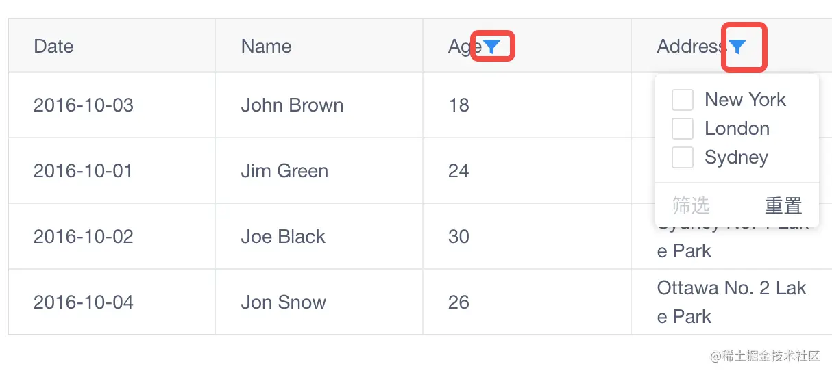 如果我们记录下需要进行表头筛选的列数组的 index,然后在点击重置时手动改变filteredValue 的值,那么不就可以清空掉所有的筛选内容: