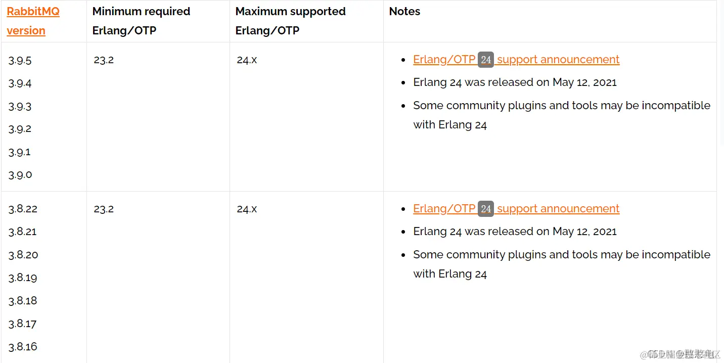 由于rabbitMQ是基于erlang环境,所以我们在使用rabbitMQ之前,首先需要配置erlang环境。在配置环境前我们需要去官网查看rabbitMQ与erlang的版本对应关系,如果版本不对应则会安装失败。