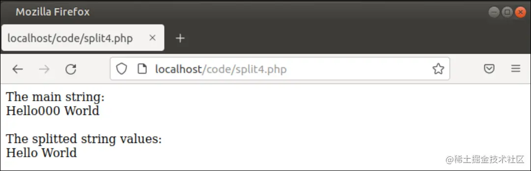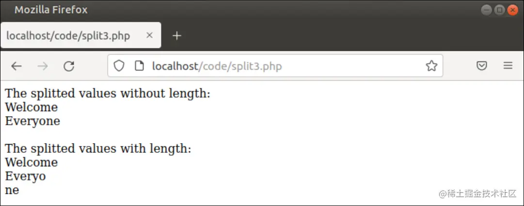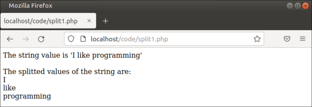 执行上述脚本后将出现以下输出。这里,文件名是split3.php,存放在**/var/www/html/code**文件夹中。