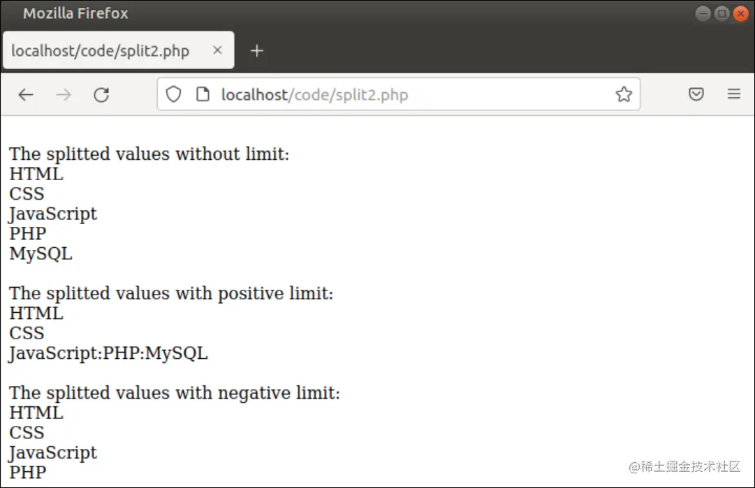 "; ? **输出。** 执行上述脚本后会出现以下输出。这里,文件名是**split1.php**,存放在**/var/www/html/code**文件夹内。 [http://localhost/code/split1.php](http://localhost/code/split1.php)  例2:用极限值分割字符串 ------------ 用下面的脚本创建一个PHP文件,根据冒号(:)分割一个字符串。这里,第一个没有限制的**explode()** 函数在根据冒号分割字符串**"'HTML:CSS:JavaScript:PHP:MySQL**"后,将返回一个有五个元素的数组。 第二个explode**()** 函数有一个正的限制值,在分割同一字符串后将返回一个有三个元素的数组。第三个**explode()** 函数的极限值为负数,在分割同一字符串后将返回一个由四个元素组成的数组。 无限制的分割值。