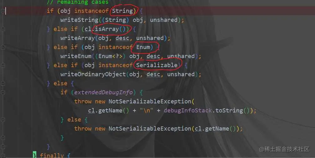 除了这个接口,还有string,枚举和数组(Array)也会放行,因为string和枚举都实现了Serializable这个接口,而数组是重写了readObject和writeObject,所以你会 看到arraylist的源码是数组,被transient修饰(以为不会被序列化),但是实际是会被序列化的,因为它自定义了序列化策略。