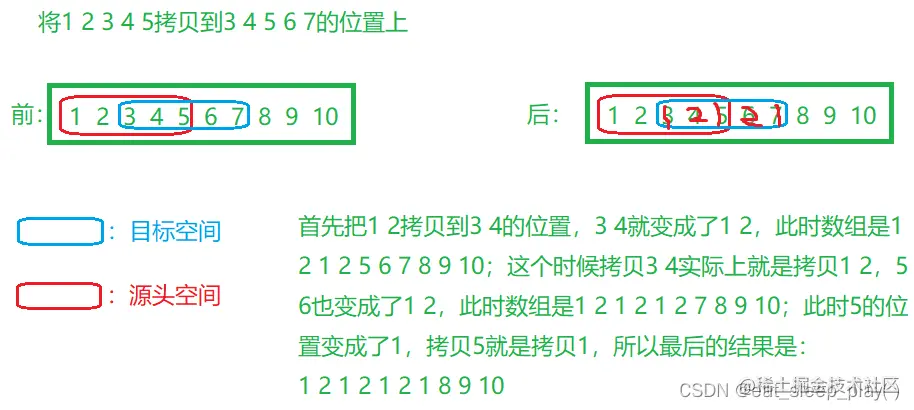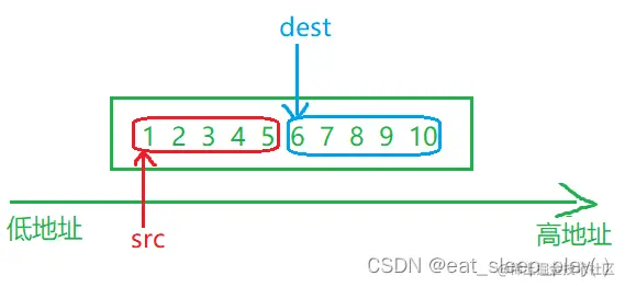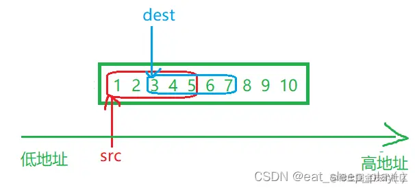 在 dest 的起始位置在 src 的范围内的时候,就要采用从后往前处理数据的方式(先拷贝5,最后拷贝1)来避免数据重叠而带来的错误。