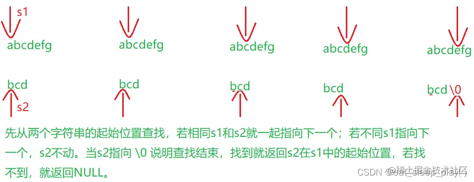 这个函数有两个参数,第一个参数是比较长的串,第二个是子串;函数的目的是要在这个比较长的串中查找子串是否存在。如果找到了子串会返回子串在长串的起始位置,找不到则返回一个空指针
