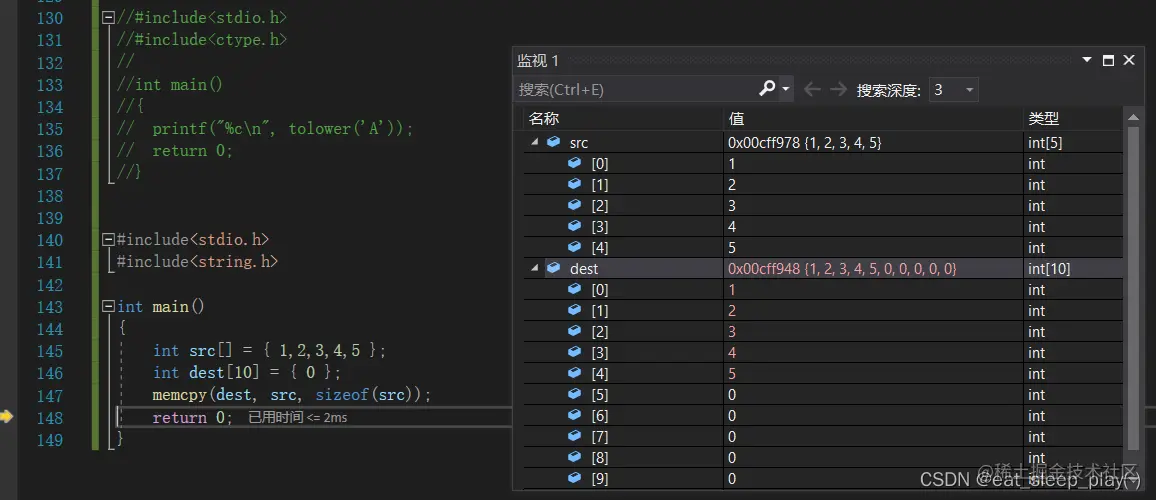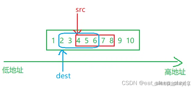 当 src 的起始地址在 dest 的起始地址左边的时候,就要采用从前往后处理数据的方式(先拷贝4,最后拷贝8)来避免数据重叠而带来的错误。