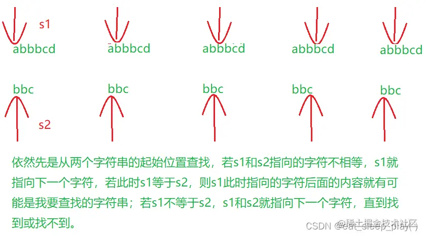 值得注意的是,当s2全都对比过后还没有查找到,而且s1还有字符为对比过,则就要把s2重置到起始位置,把s1重置到第一次与s2相等的后面的字符,然后从这里开始对比,直到结束。