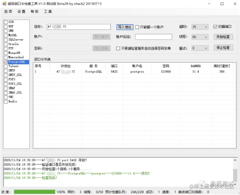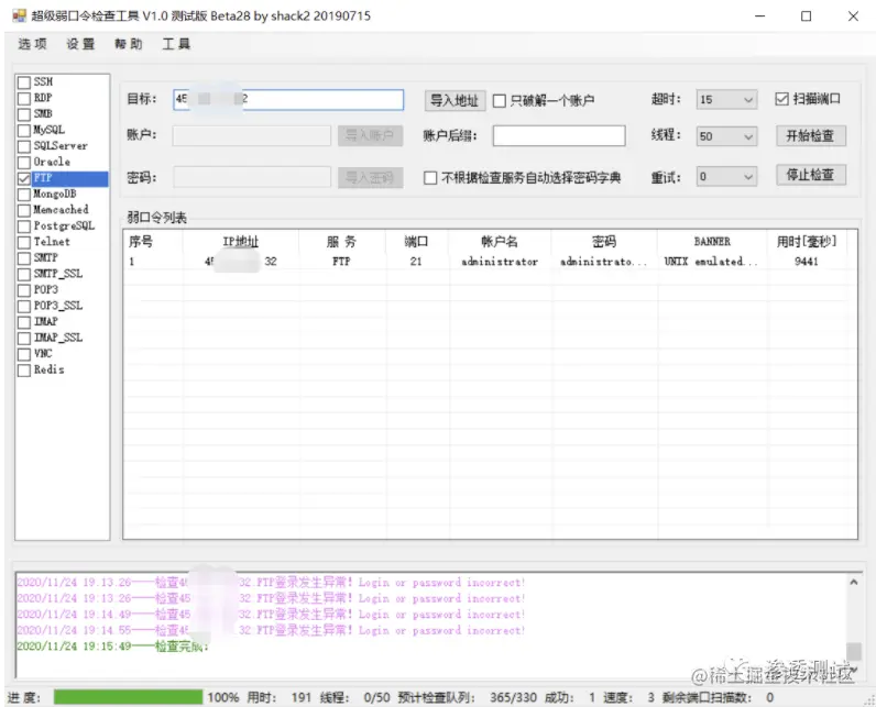 2.支持批量导入IP地址或设置IP段,同时进行多个服务的弱口令检查。