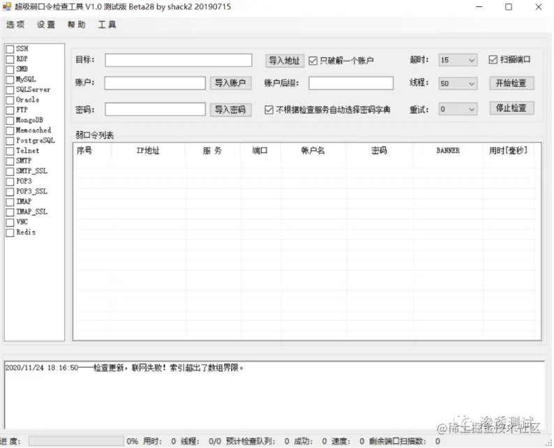 在渗透测试中,针对各项服务(FTP、RDP等)的爆破往往是繁琐的,一款好用的爆破工具,可以提高渗透测试的效率,超级弱口令检查工具(作者shack2)支持很多服务的爆破,支持批量导入爆破。