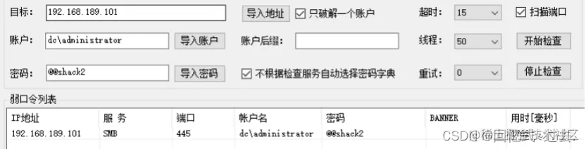 检查SMB服务一般需要开放445端口,如果需要检查域账号弱口令,需要在用户名前面加上“域名称\”。类似“dc\administrator”。