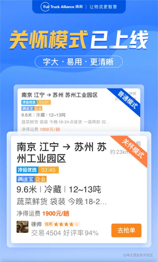 **值得一提的是,满帮的产品思维也在与时俱进。**例如从2021年11月开始,满帮关注到部分用户对大字体的需求。《2021年货车司机从业状况调查报告》显示,中国的货车司机主要以大龄男性群体为主,其中46岁以上货车司机人数超过1/4。为此,满帮今年推出了关怀模式,优化字体和信息的展示逻辑,让操作更清晰。满帮也成为行业首家响应国家适老号召的企业。