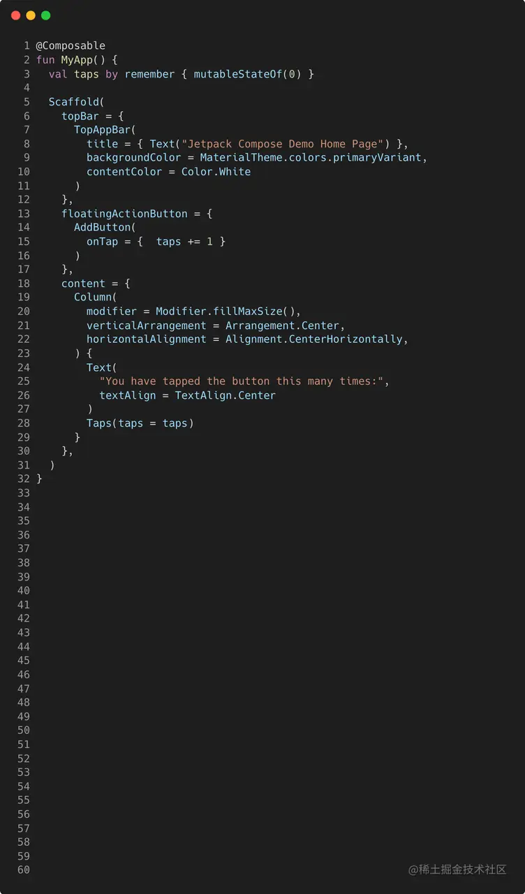 即使同为函数组件的 React 相比,Compose 也更胜一筹,Composable 无论定义还是使用都是基于 Kotlin,使用体验更一致。而 React 的函数式组件需要在 JSX 中使用,虽然符合前端开发习惯,但是但从代码复杂度上来说是不友好的。另外 Composable 没有返回值,连 return