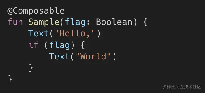 在 Composable 中这些都不是问题,因为 Compose 独有的 Positional Memoization 机制,可以根据静态的代码位置存储状态,不会受到运行时的分支条件变化的影响。另外 Compose 所有代码都是同构的,不会存在 JSX 无法插入 Hooks 的窘境,所以上面两种 React 中的禁忌在 Compose 中都可以实现: