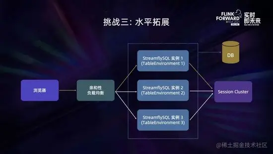 但是并不是所有状态都可以持久化的,另外有些状态我们故意会不持久化。比如用户使用 SET 命令来改变 TableEnvironment 的属性,比如开启 Table Hints,这些属于临时属性,会在重建 TableEnvironment 后被重置。这是符合预期的。再比如用户提交 select 查询做调试预览时,TaskManager 会与 StreamflySQL 后端建立 socket 链接,而 socket 链接显然也是不可持久化的。因此我们在 StreamflySQL 的多实例前加了亲和性的负载均衡,按照 Session ID 来调度流量,让在正常情况下同一个用户的请求都落到同一个实例上,确保用户使用体验的连续性。