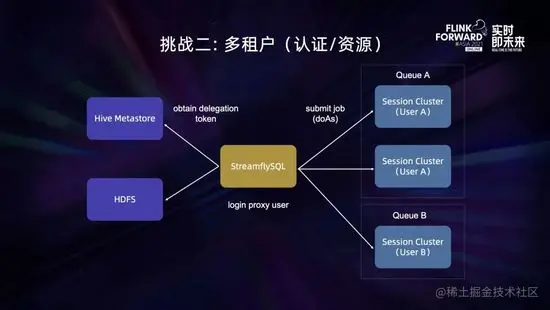 - 在认证方面,因为 Session Cluster 属于不同用户,所以 StreamflySQL 后端需要实现多租户的伪装。在网易游戏,组件一般会使用 Kerberos 认证。我们采用多租户实现的方式是使用 Hadoop 的 Proxy User,先登录为超级用户,然后伪装成项目用户来向不同组件获取 delegation token,这里的组件主要是 Hive MetaStore 跟 HDFS,最后把这些 token 存到 UGI 里面并用 doAS 的方式来提交作业。