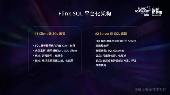 有同学可能会问,为什么没有 JobManager 端 SQL 编译,这是因为 JobManager 是相对封闭的组件,不适合拓展,而且即使做了达到的效果跟 Client 端编译效果基本一样。所以总体来看,一般就有 Client 和 Server 两种常见的 Flink SQL 平台架构。