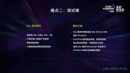 - 首先对于调试的 SQL,系统会在 SQL 翻译的时候将原来的一个 Sink 替换为专用的 PrintSink,这解决了需求中的前两点。