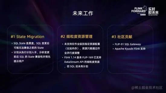 - 未来我们首先要解决的一个问题是 State 迁移的问题,即用户对 SQL 进行变更后,如何从原先的 Savepoint 进行恢复。目前只能通过变更类型来告知用户风险,比如通常而言加减字段不会造成 Savepoint 的不兼容,但如果新增一个 join 表,造成的影响就很难说了。因此后续我们计划通过分析 SQL 变更前后的执行计划,来预先告知用户变更前后的状态兼容性。