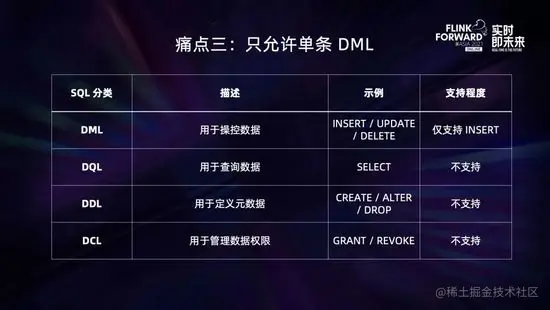 - 最后是 DCL,用于管理数据权限,比如 GRANT 跟 REVOKE 语句。这个 Flink SQL 是不支持的,原因是 Flink 目前只是数据的用户而不是管理者,DCL 并没有意义。