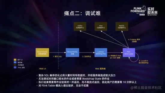 - 第二,该架构没法去调试时间窗口比较长的作业或者需要 Bootstrap State 的作业。