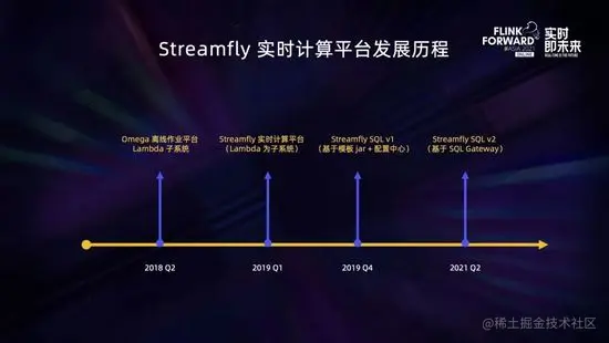 Streamfly 前身是离线作业平台 Omega 下的名为 Lambda 的子系统,它负责了所有实时作业的调度,最开始开始支持 Storm 和 Spark Streaming,后来改为只支持 Flink。在 2019 年的时候我们将 Lambda 独立出来以此为基础建立了 Streamfly 计算平台。随后,我们在 2019 年底开发并上线了第一个版本 Flink SQL 平台 StreamflySQL。这个版本基于模板 jar 提供了基本 Flink SQL 的功能,但是用户体验还有待提升,因此我们在 2021 年年初从零开始重新建设了第二个版本的 StreamflySQL,而第二个版本是基于 SQL Gateway。