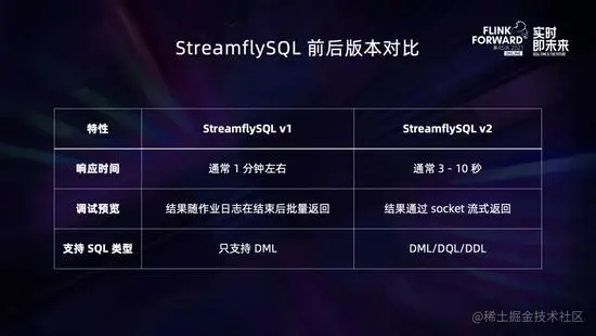 综合来看,v1 版本只支持了单条 DML,这让我们很漂亮的 SQL 编辑器变得空有其表。基于以上这些痛点,我们在今年调研并开发了 StreamflySQL v2。v2 采用的是 Server 端 SQL 编译的架构。