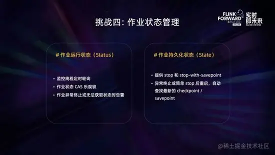 - 第二个含义是 Flink 的持久化状态,即 Flink State。原生的 SQL gateway 并没有管理 Flink 的 Savepoint 和 Checkpoint,因此我们加上了 stop 和 stop-with-savepoint 的功能,并强制开启 retained checkpoint。这使得在作业遇到异常终止或者简单 stop 之后,再次重启时系统可以自动查找到最新的 checkpoint。