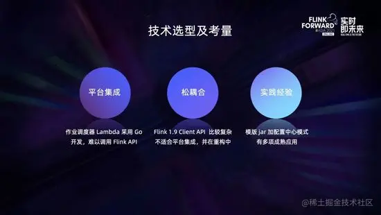 - 首先是平台集成。不同于很多公司的作业调度器用大数据中比较主流的 Java 编写,我们的 Lambda 调度器是用 Go 开发的。这是因为 Lambda 在设计之初支持了多种实时计算框架,出于松耦合和公司技术栈的考虑,Lambda 以 Go 作为开发语言,会采用与 YARN 类似的动态生成 Shell 脚本的方式来调用不同框架的命令行接口。这样松耦合的接口方式给我们带来很大的灵活性,比如我们可以轻松支持多个版本的 Flink,不需要强制用户随着系统版本升级,但同时也导致没办法直接去调用 Flink 原生的 Java API。