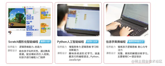 我们可以看出少儿编程打的旗号是培养孩子编程思维、遍玩遍入门。