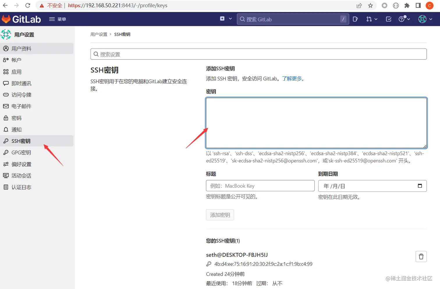 需要把自己ssh的公钥提交到gitlab
