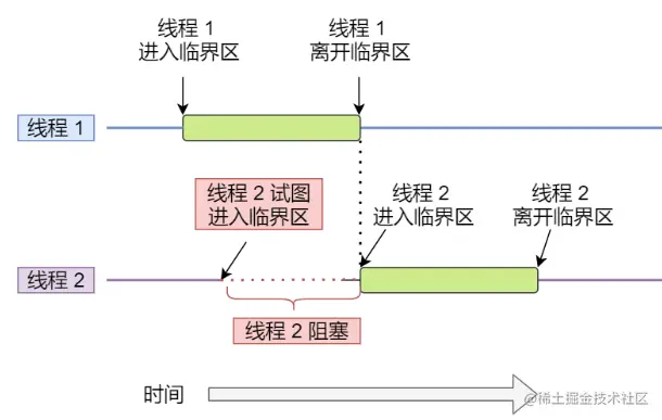 - 互斥:线程对于需要的资源进行互斥的访问(例如一个线程抢到锁)
