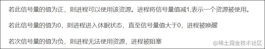 - V 操作:将 sem 加 1,相加后,如果 sem <= 0,唤醒一个等待中的进程/线程,表明 V 操作不会阻塞;