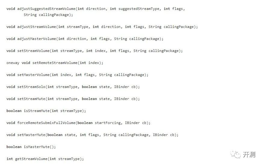 这个类是一个接口类,其中 setStreamVolume, 4个参数(参数越多,反射越困难,并且 u1 包是不包含 context 对象的)